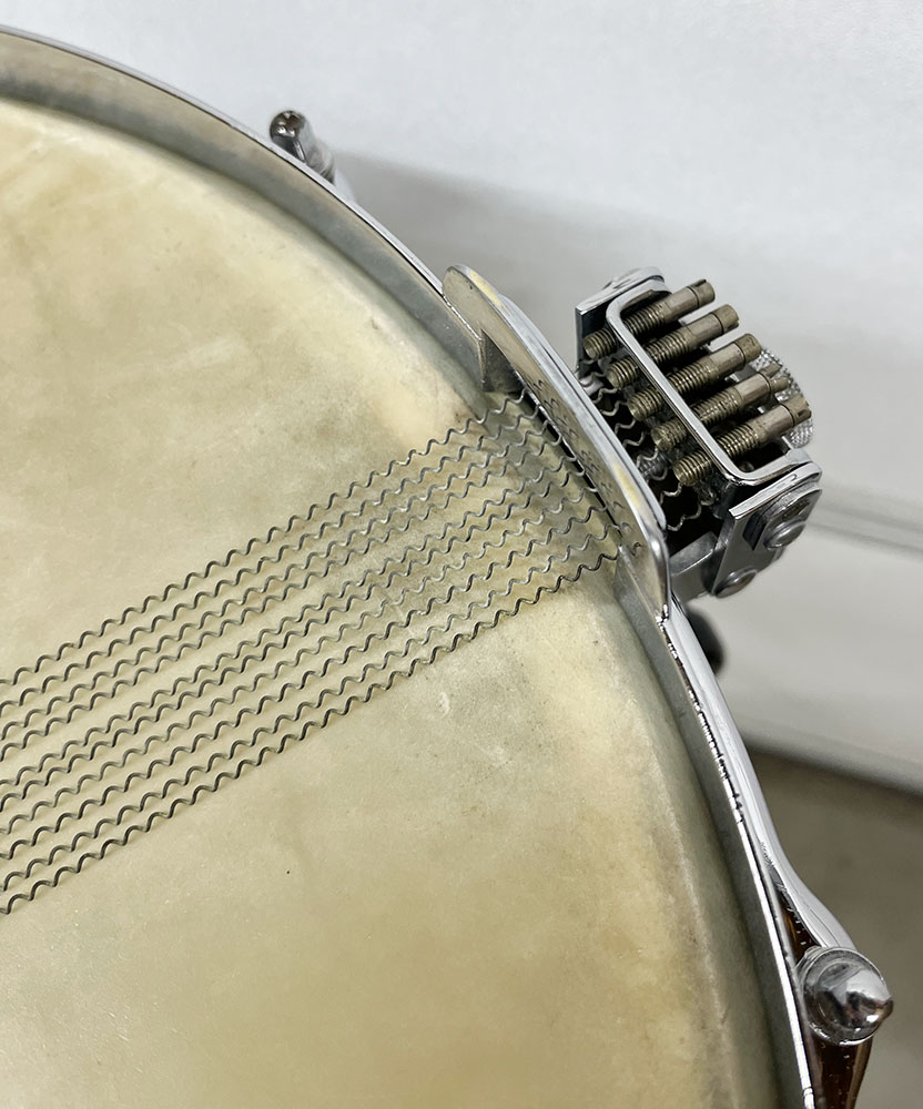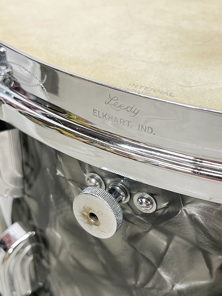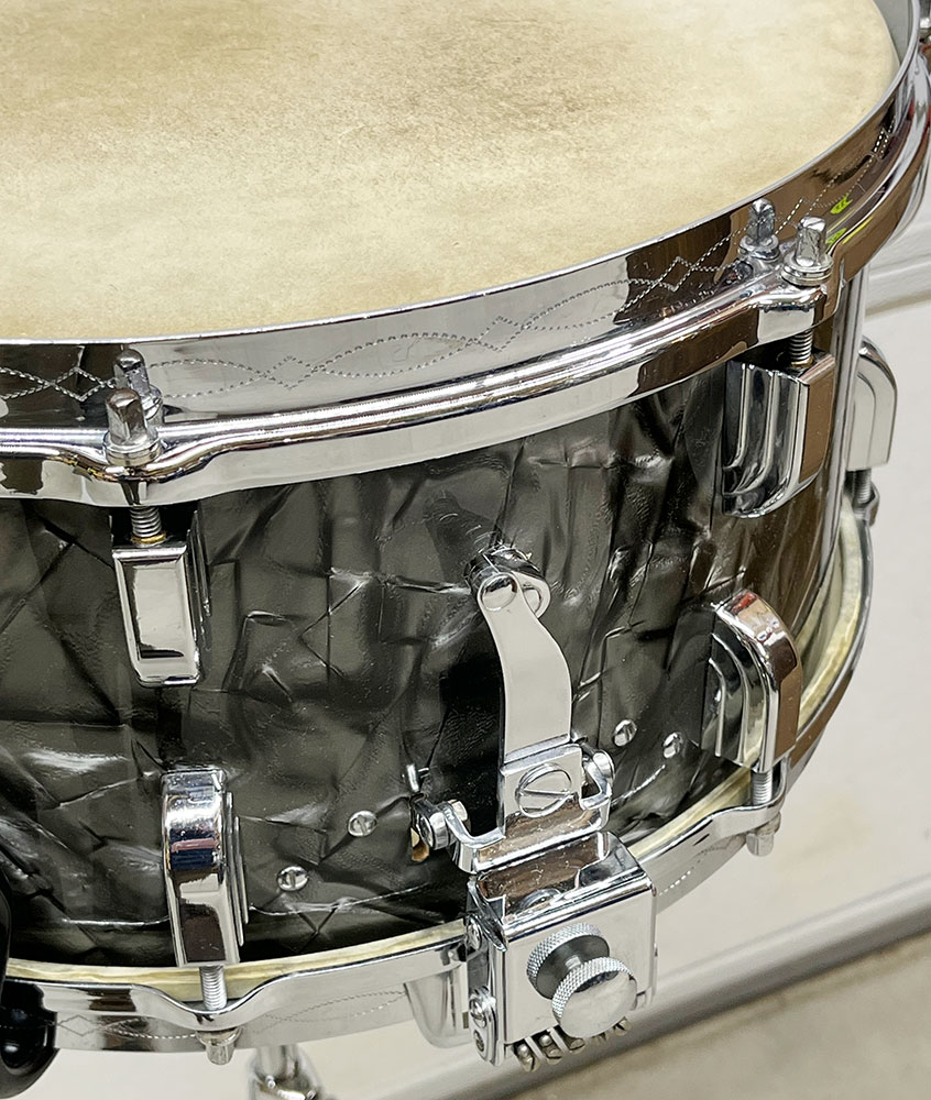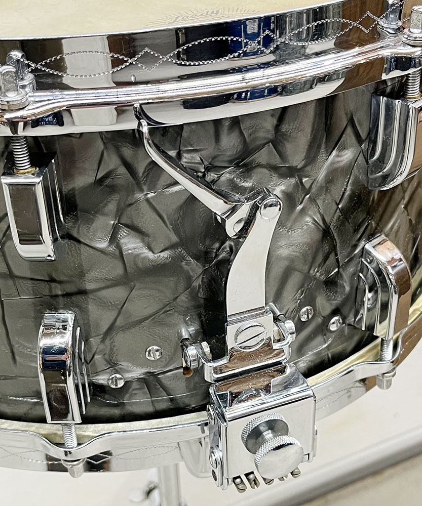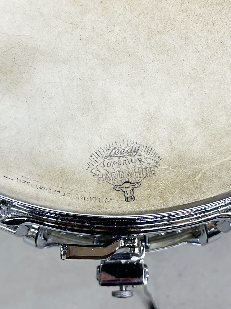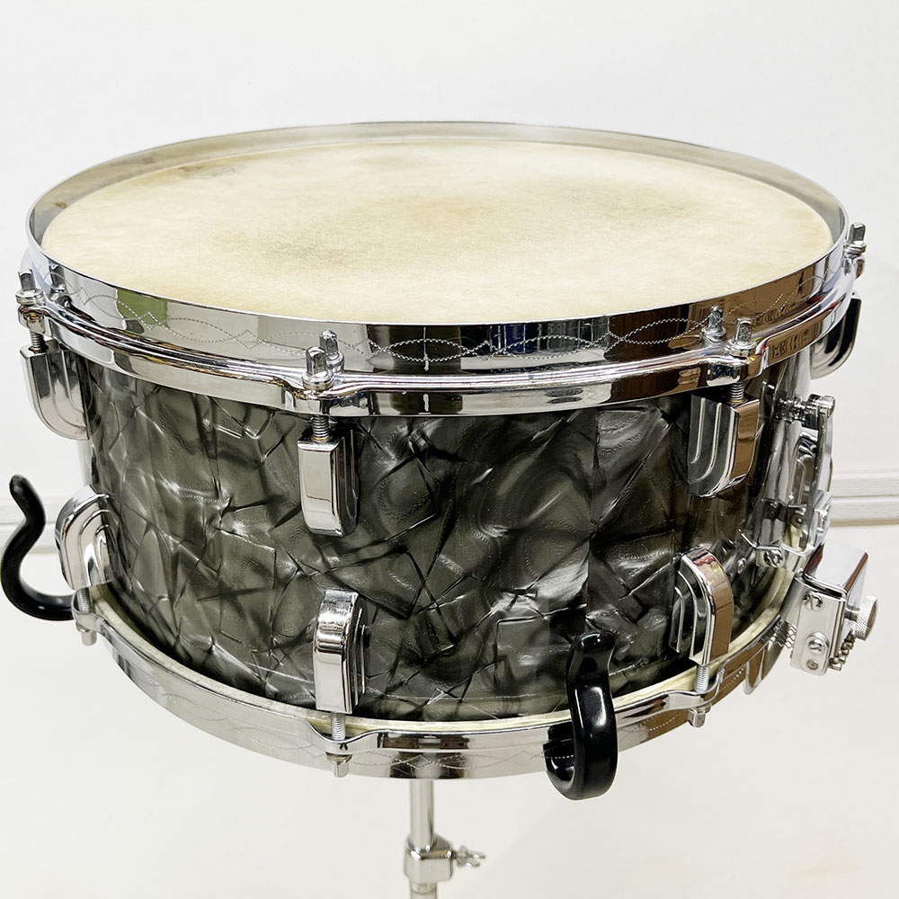 For sale is an absolutely incredible Vintage 1939 Leedy Broadway Parallel Snare Drum in Black Diamond Pearl in near mint shape. Drum appears to be 100% original down to the heads. 6.5″x14″ three ply shell is in-round with very nice original factory edges. Wrap is tight, glossy and in top condition. No mods, issues or extra holes. Very, very minor wear on the chrome hardware as shown – mostly on the muffler knob. Features the engraved stick chopper chrome over brass hoops. Black date stamp of 3906 (June of 1939) present. A time capsule of a snare drum, featuring the most hard to find third generation parallel strainer set up, in remarkable shape. A stunner all around and a crown jewel of any collection.